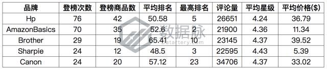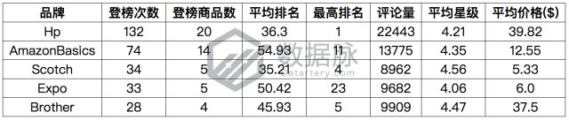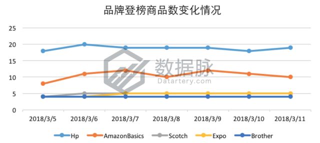 可以看到,在上周的Best Sellers榜单中,两大品牌——Hp与AmazonBasics分别取得了132次与74次登榜,再次分别占领了品牌综合排名前二。与此同时,胶带产品品牌 Sotch、马克笔产品品牌Expo、打印机及相关配件品牌Brother也在上周有着稳定的榜单发挥,分别以登榜次数34次、33次、28次的成绩位列品牌 综合排名的第三、四、五位。