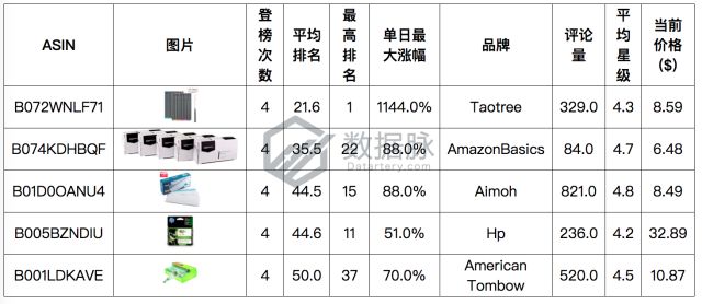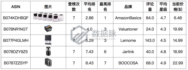 根据上周Hot New Releases榜单上商品的登榜次数及平均排名,骆探长对登榜的商品进行了排序,其中排名靠前的五款商品如下所示: