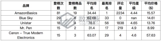 根据上周Movers & Shakers榜单上各个品牌下商品的登榜次数,我们对登榜的品牌进行了排序,其中排名靠前的五个品牌如下所示: