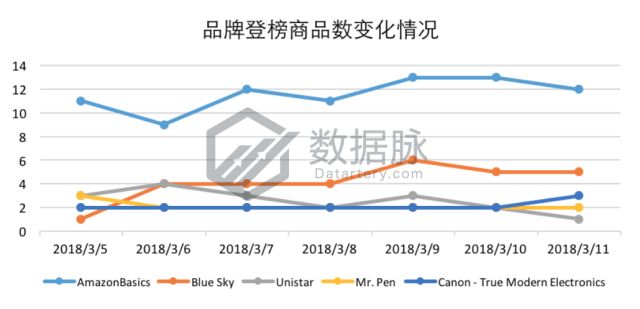 可以看到,在上周Office Products品类的Hot New Releases榜单中,亚马逊自营品牌AmazonBasics在一周中始终保持着每天进榜至少9款商品的优秀发挥,以81次的总等榜次数完美碾压同榜竞争的其他品牌。 同时骆探长(shujumai.com)注意到,以活页笔记本为主营产品的品牌Blue Sky在上周也有着颇为亮眼的榜单表现,品牌的每日上榜商品数在一周中保持着稳步上升的趋势,并于7天中共获得了29次登榜,成功位居品牌综合排名第二。此外,以标签胶带 为主营产品的品牌Unistar以及文具品牌Mr.Pen也在上周的Hot New Releases榜单中分别取得了18次与15次进榜,位列品牌综合排名第四、五位。
