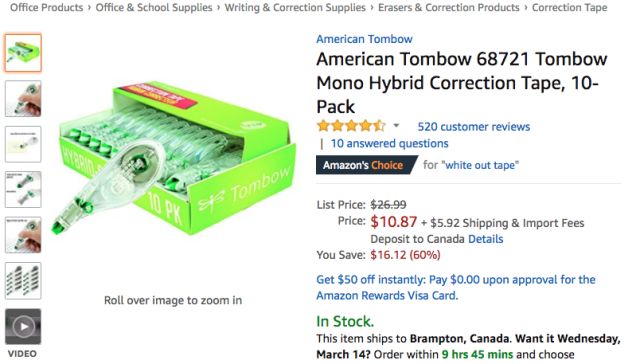 此外骆探长(shujumai.com)注意到,一款来 自品牌American Tombow的老牌改正带产品同样在上周4次跻身Movers & Shakers榜单,位列商品综合排名第五,相关产品在近期的市场潜力有待进一步发掘。