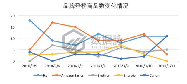 可以看到,在上周Office Products品类的Movers & Shakers榜单中,五个榜单大牌“厮杀正酣”。其中,品牌Hp再次凭借在3月5日单天夺下18次登榜机会的突出表现,以一周登榜76次的总成绩成功突围,击败总等榜次 数70次的亚马逊自营品牌AmazonBasics,位列品牌综合排名首位。此外骆探长(shujumai.com)发现,品牌Canon在3月11日突然发力,单日上榜商品数攀升至11款,品牌的近期上架商品表现同样值得关注。