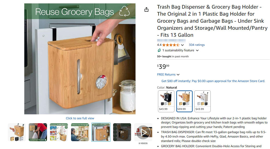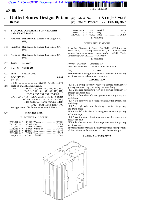 原告DON ISAAC B. RAMOS是美国人,本案维权的产品是一款塑料袋收纳盒。原告的这款塑料袋收纳盒方便的双孔通道,用于存放和重复使用您的杂货袋;开放式设计可安全地压缩松散的塑料袋。这款袋子收纳收纳盒可容纳 10-20 个或更多杂货袋。