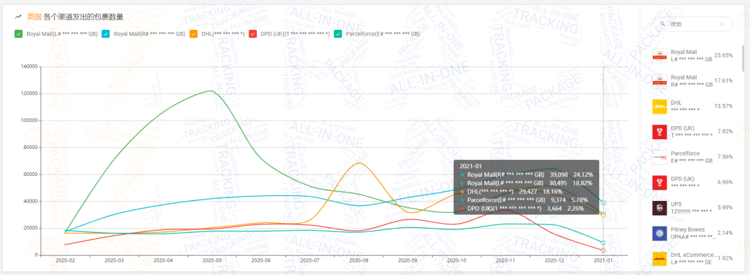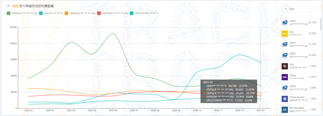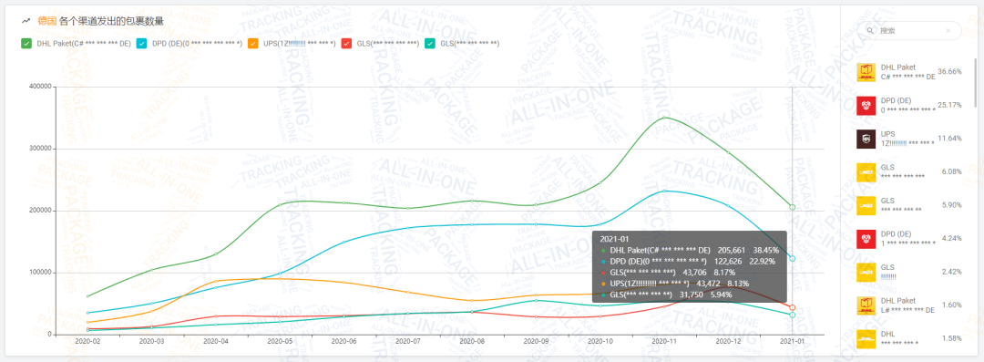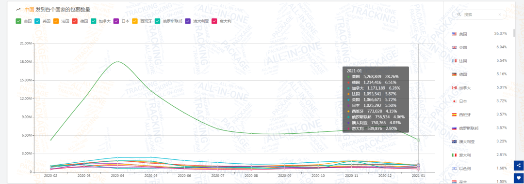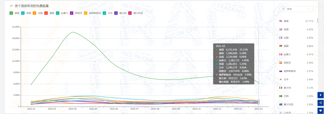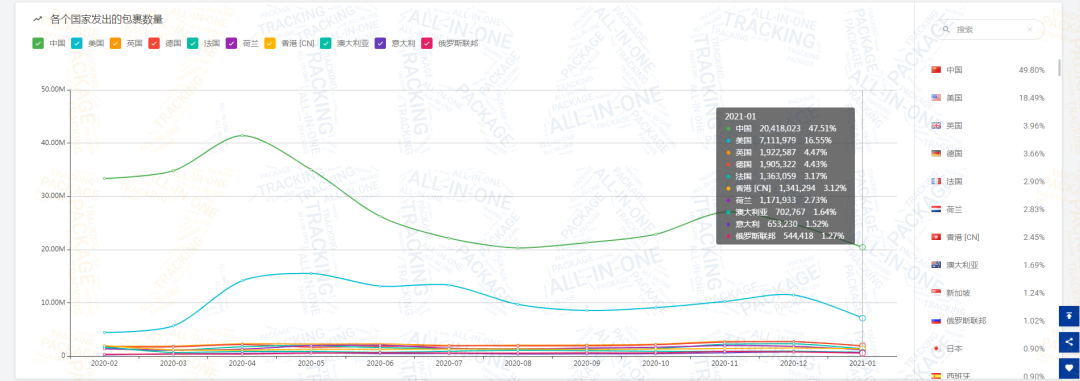2021年1月,平台总共收录查询单号超过4,297万票,其中发件的国家及地区为215个、收件的国家及地区为228个
