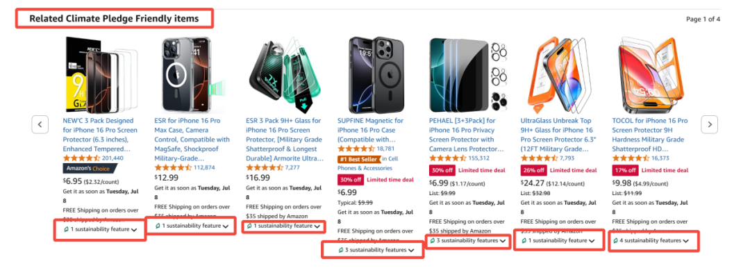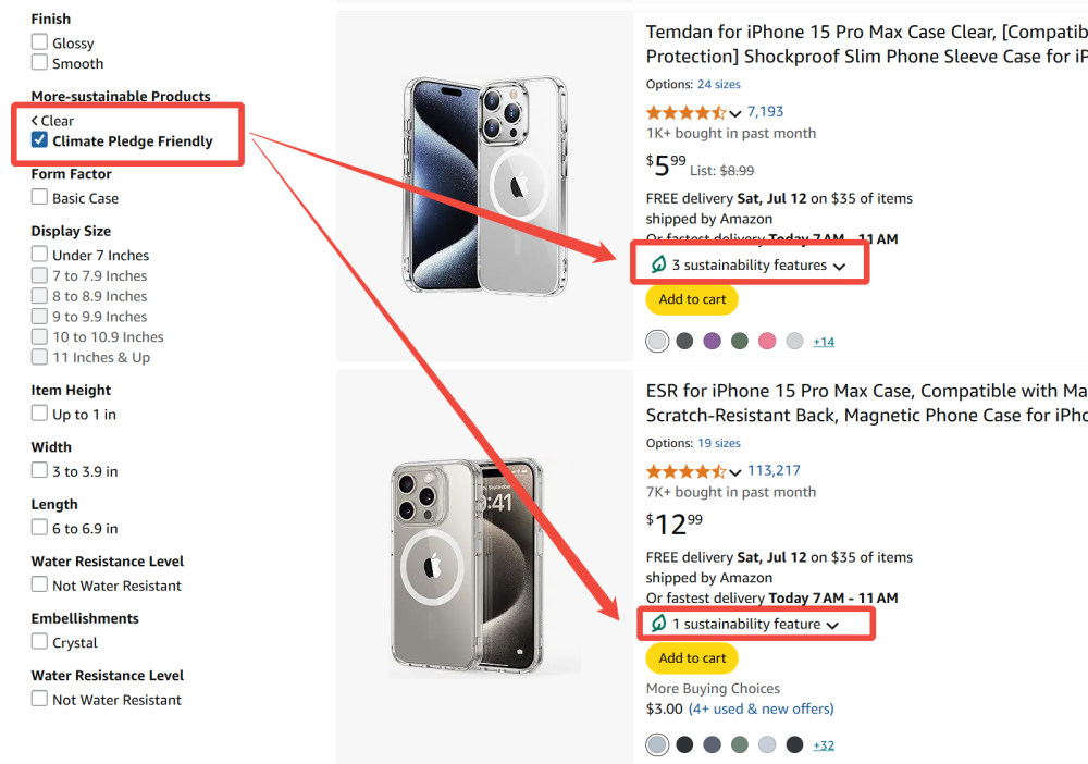 亚马逊已对站内筛选器功能做出更新,将“气候承诺友好认证”作为筛选条件正式接入系统逻辑,这意味着消费者在筛选结果时可以主动选择“仅查看环保认证商品”。