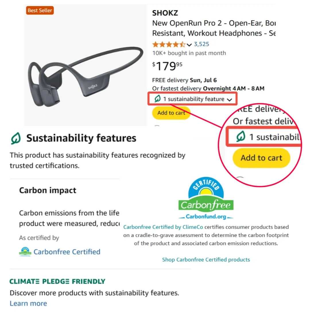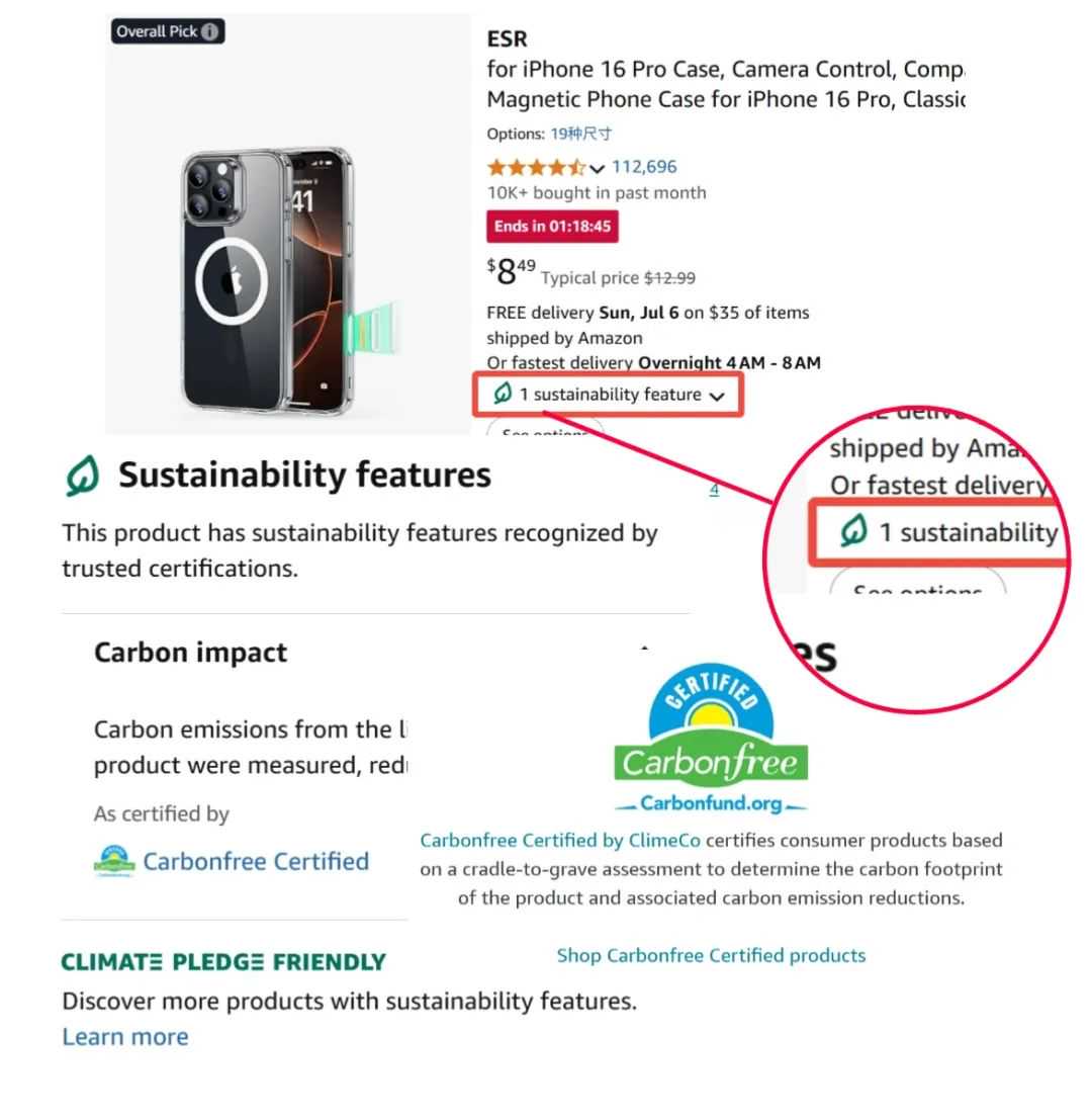 在搜索结果页中,带有“气候承诺友好(Climate Pledge Friendly,简称CPF)”标识的产品,系统自动添加绿色徽章。这一视觉强化不仅增强了用户识别度,更重要的是: