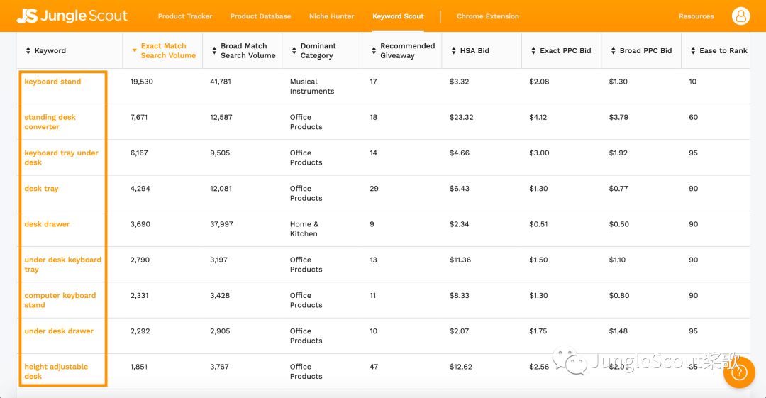 大家还记得在亚马逊上输入Keyboard Tray只能显示以这个根关键词开头的词,市面上其他关键词调研工具也都是类似的结果,但是Jungle Scout的Keyword Scout显示的亚马逊上的消费者搜索并实际上购买Keyboard Tray的关键词,例如 desk tray、computer keyboard stand、standup desk等等;甚至有可能吸引到消费者本来不知道有Keyboard Tray这样的产品,他们一开始只是单纯寻找符合人体工程学的办公家具。仅仅因为我们将自己的产品命名为 Keyboard Tray 并不一定表示消费者也会用一样的关键词来搜索这个产品。这点对于中国卖家来说是尤其重要的,语言、文化的差异让我们更难去了解消费者的搜索习惯,但是有了Keyword Scout 就可以完美解决这个问题。