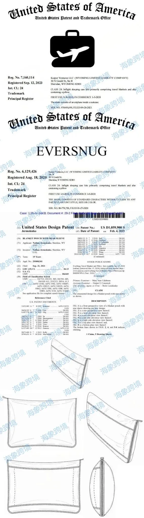 Kuiper Ventures LLC 是一家注册于美国的有限责任公司,专注于旅行装备的设计、生产和销售, 其核心品牌 EverSnug 主打便携式旅行毯等产品,强调“可折叠、易悬挂”的特性以解决旅行中的保暖和空间占用问题。案件涉及商标和专利已曝光如下,请相关卖家注意排查避雷!