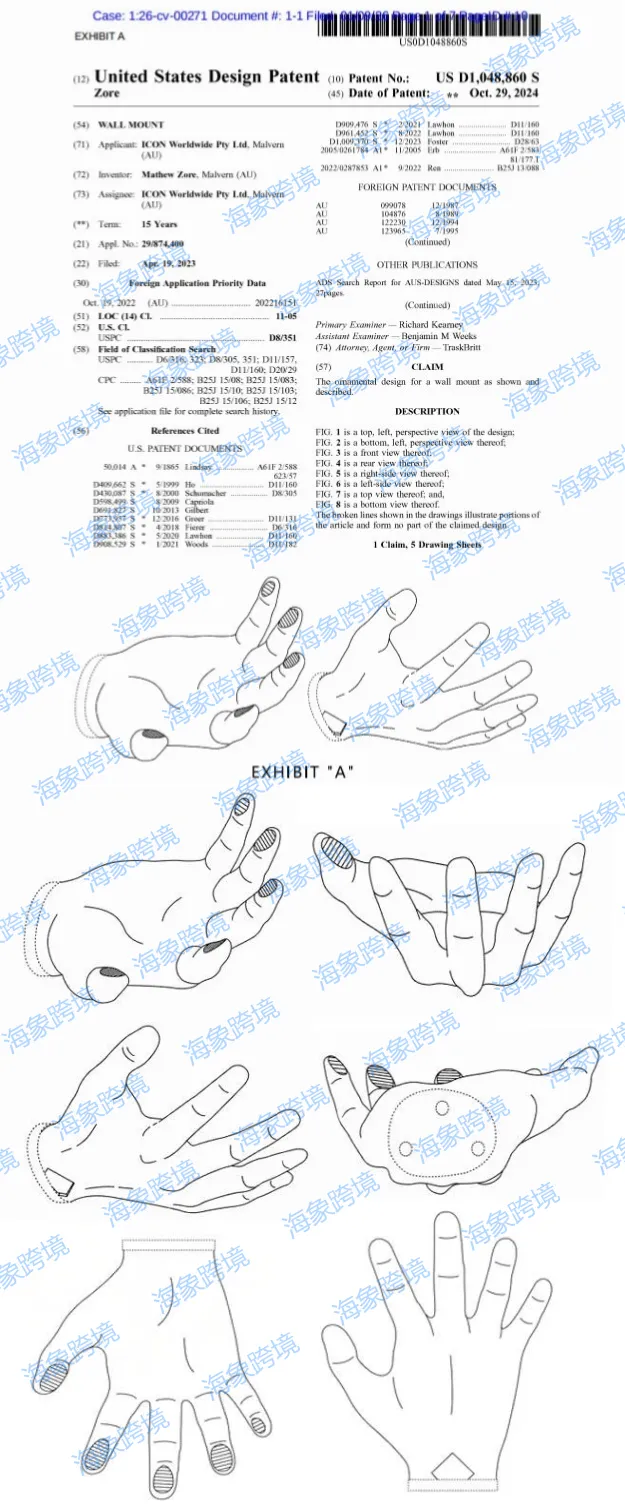 原告 ICON WORLDWIDE PTY LTD 是一家位于澳大利亚的公司。案件涉及专利产品是一款手型壁挂支架,专利细节如下,请有关卖家注意排查避雷!