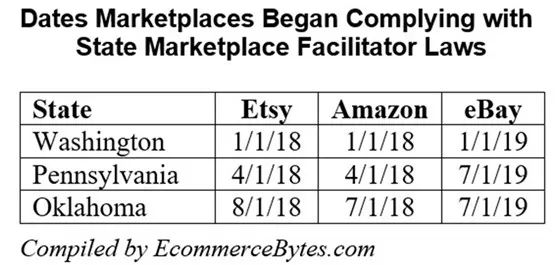 以下是亚马逊、Etsy和eBay向华盛顿、宾夕法尼亚和俄克拉何马州着三个州消费者征税的具体时间: