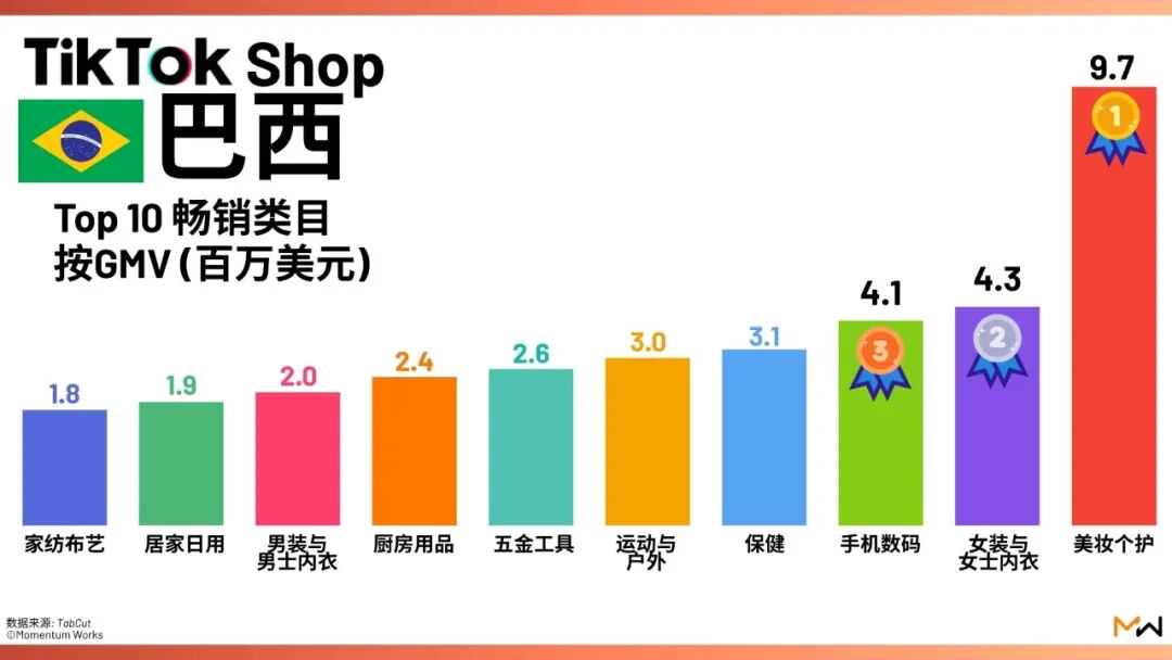巴西市场GMV的类目结构也和美国市场很相似,一方面是消费者偏好的相似性,另一方面也是TikTok平台特征在发挥作用。排名前列的商品类别还有“女装与女士内衣”、“手机与数码”、“保健”、“厨房用品”。这些类别通常被认为更适合通过视频、直播等内容分发。