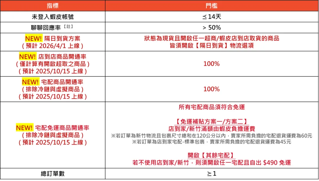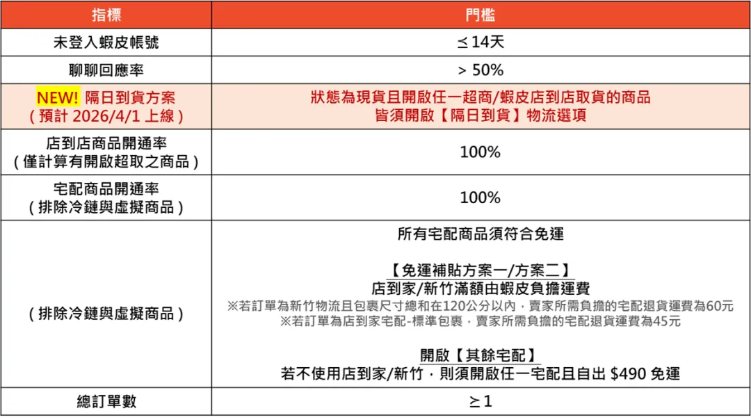 据 Shopee 台湾站消息,为了协助提升卖家业绩以及优化消费者的购物体验,预计自 2026 年 4 月 1 日起,虾皮商城卖家规范将新增【隔日到货】条件,详细规范说明请参考下方内容。