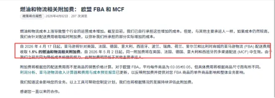 2026年4月17日起:FBA配送费临时上调1.5%。