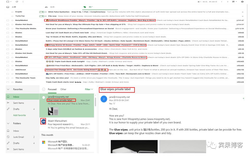 邮件在准确的时间触达目标用户后,通过点燃用户的点击欲望促成打开率。通过GMAIL和OUTLOOK的收件视角发现(买家是通过自己邮箱收到卖家邮件的):标题和前30个单词内容是点燃点击欲的重要着手点。无论利用买家的什么心理写标题,都需要通过A/B Test,监控打开率数据的变化,来确定最后的标题内容。