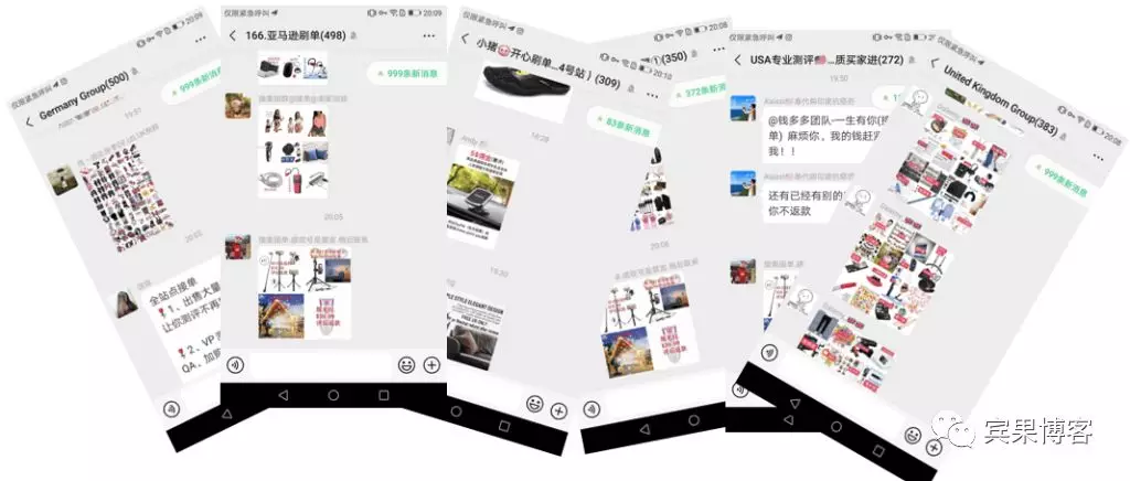 这里汇集了华人,老外,卖家以及服务商,换群就能进,可以说是鱼龙混杂。想要在这里获得好的成绩,先换部手机弄30-50个群进来,每天做好邀评图片,在里面狂轰滥炸,等着鱼咬钩吧。当然如若你有微商群控的本领,弄100来个群去邀,效果会好些。但是!!我认为做为一个地地道道的卖家,从长远看这是一件没有沉淀的工作,最重要的是你永远没服务商专业效率,所以作者在这个渠道只做放单。根据对买家账户的判断,此方法的安全性以及权重系数都有待考量,时效性和灵活性也一般,不具有可持续性。