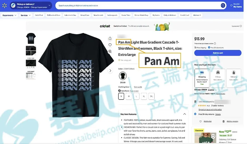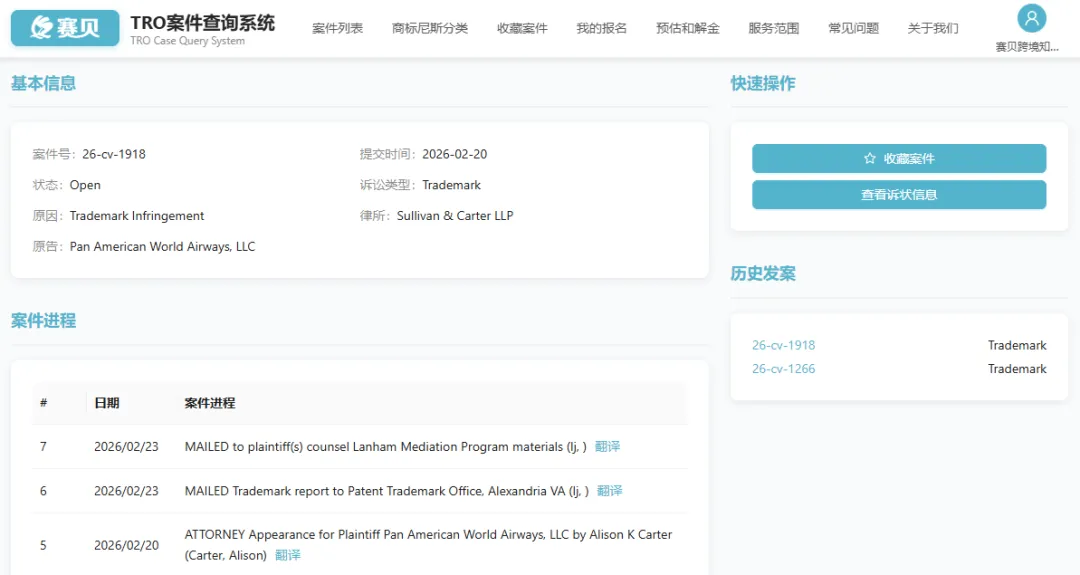 从赛贝TRO案件查询系统获悉,Pan American World Airways, LLC泛美航空2月份发起2个TRO商标维权案件,涉案范围覆盖亚马逊、eBay、沃尔玛、SHEIN等主流美国跨境电商平台及独立站,涉足箱包、服饰、玩具、文创等多个品类。