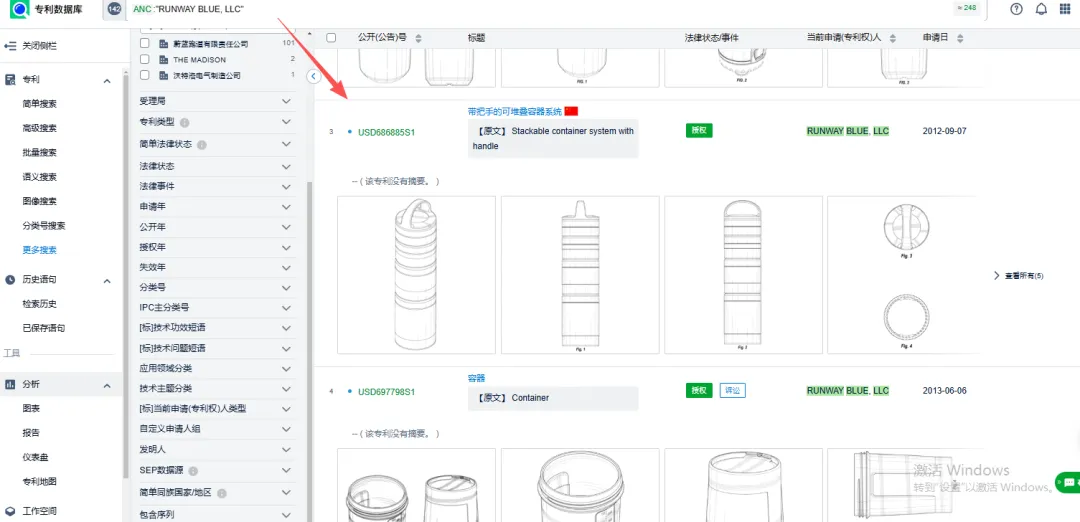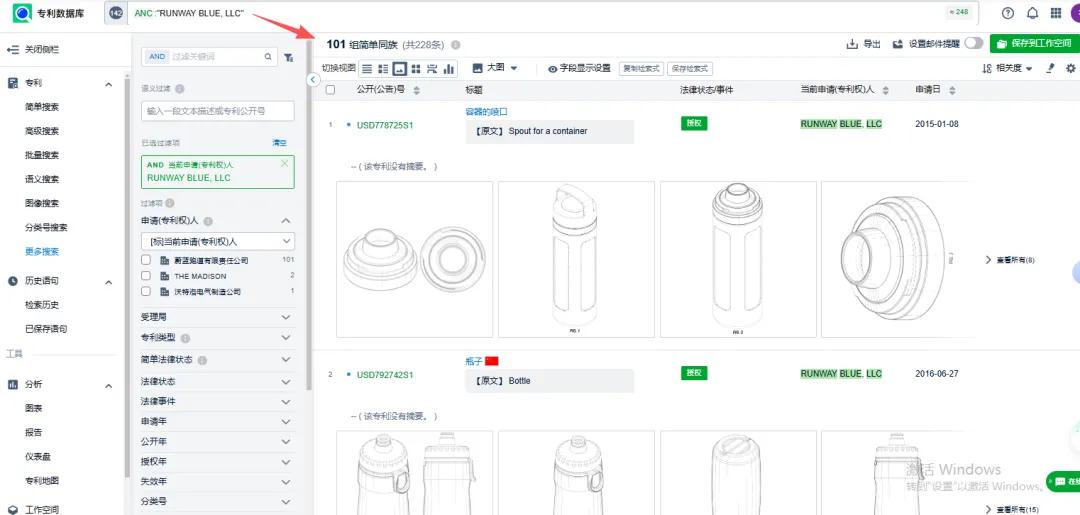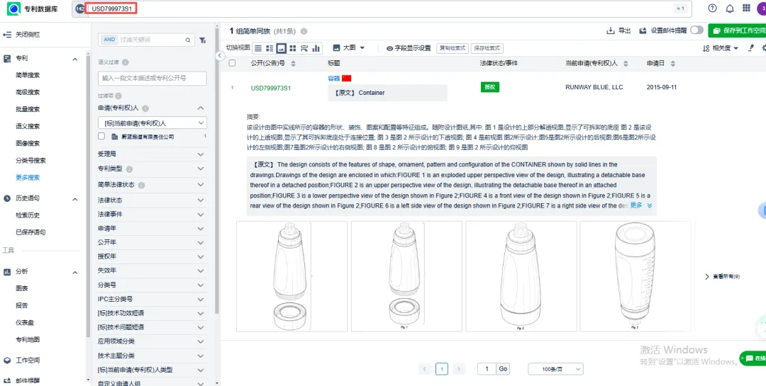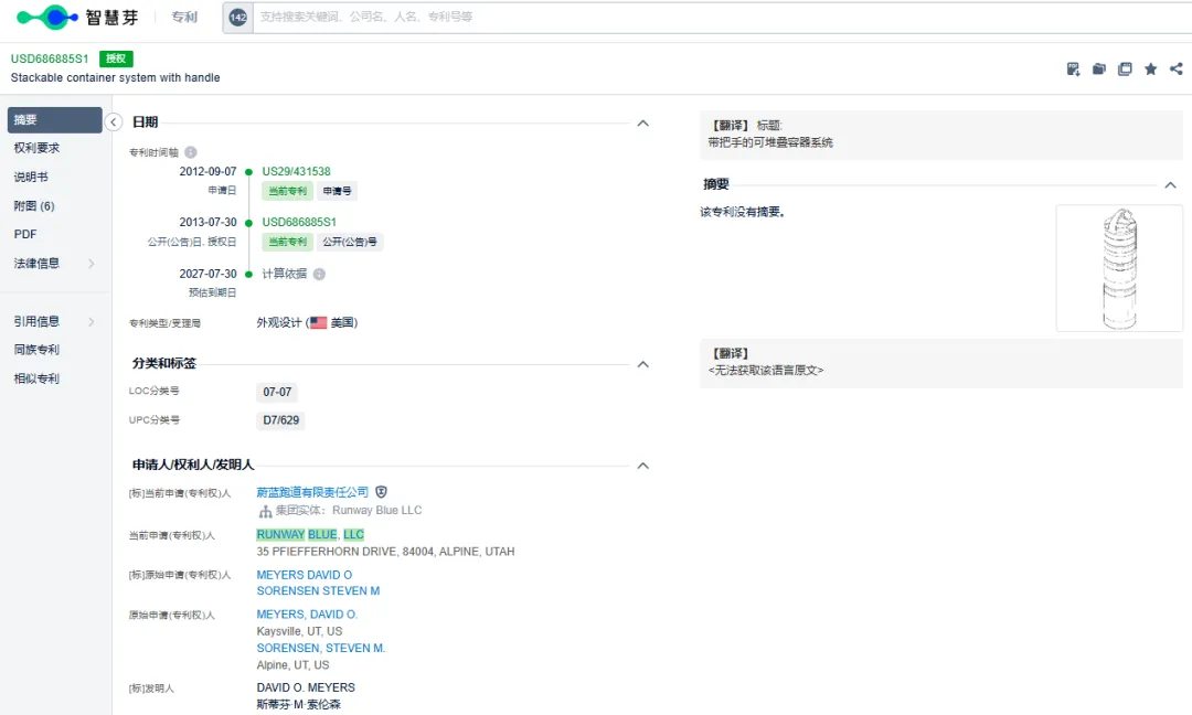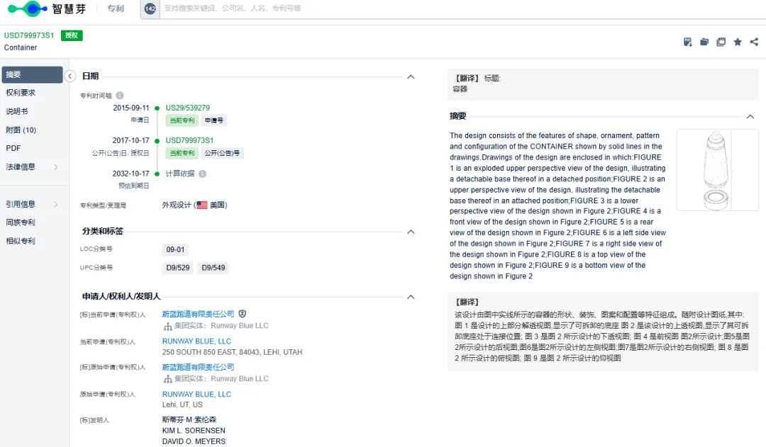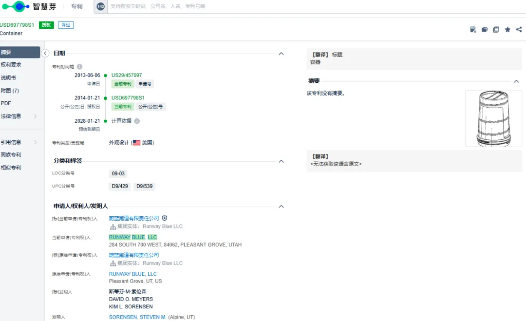 用权利人RUNWAY BLUE, LLC查询,可以看到能查到权利人名下产品的专利详情。