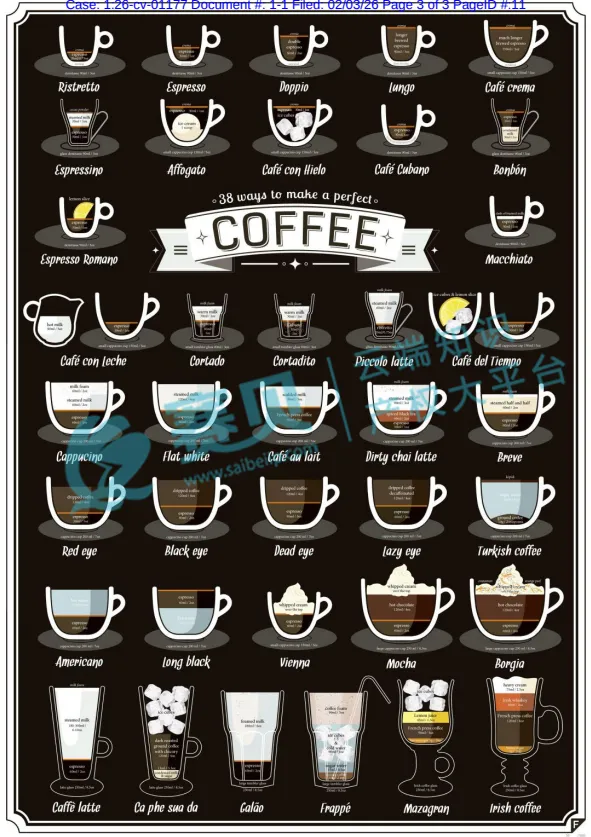 【26-cv-1177】38种咖啡制作方法版权图TRO维权,原告Grazyna Maniecka,200跨境电商店铺被起诉,另还有刀具信息图版权也正在TRO维权中。