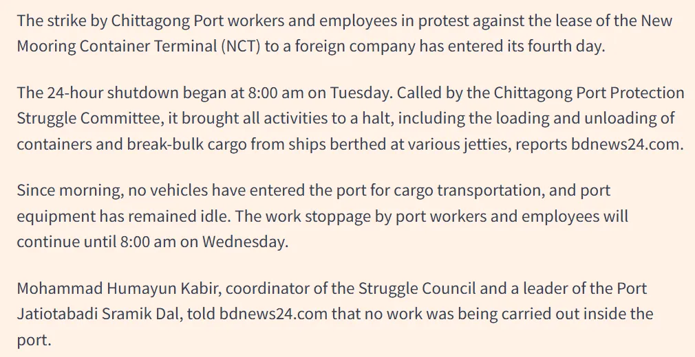 吉大港承担了孟加拉国90%以上的进出口贸易。罢工每持续一小时,损失都是天文数字: