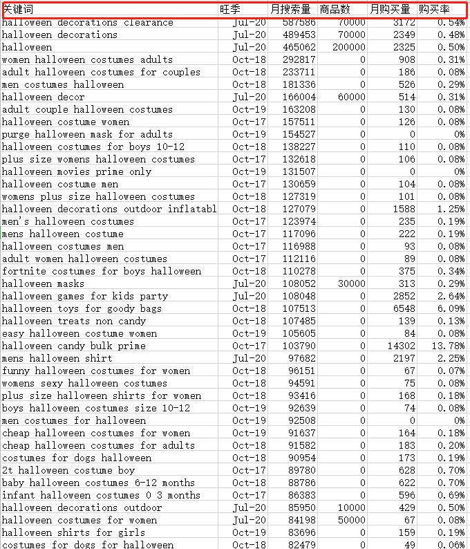 每个词都有 1000 个长尾关键词词组,还有各个词组的月度搜索趋势、搜索旺季、月搜索量、商品数、月购买量以及购买率等数据。