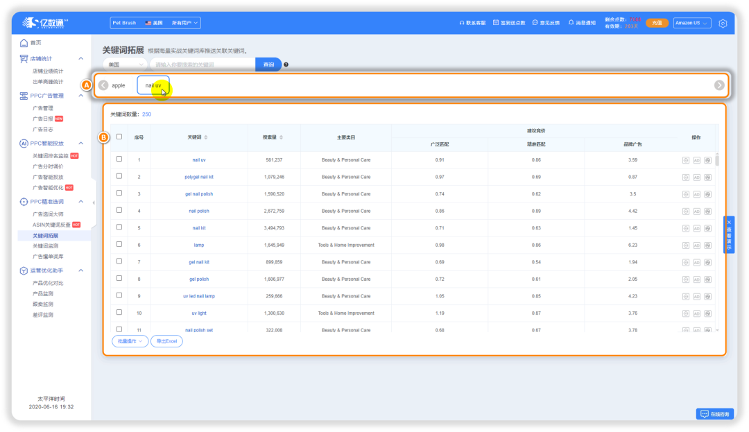 2. 点击任一亚马逊收录关键词的右侧按钮