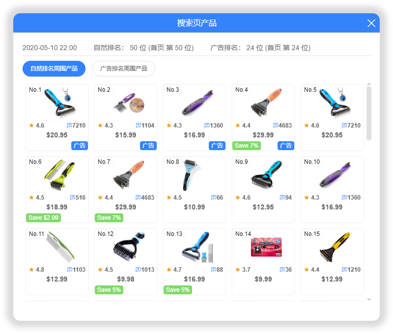 2. 选择自然搜索页面或广告排名搜索页面,即可查看与该关键词或ASIN产品在同一自然搜索页面或广告搜索页面的竞品信息,包括产品首图、价格、评分与review、优惠券信息