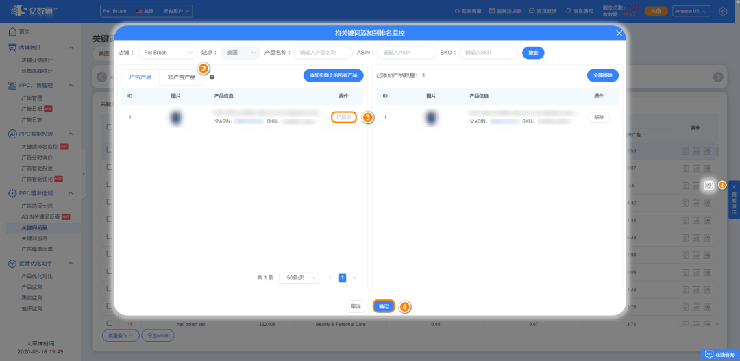 2. 选择并添加产品,点击确认完成添加关键词排名监控