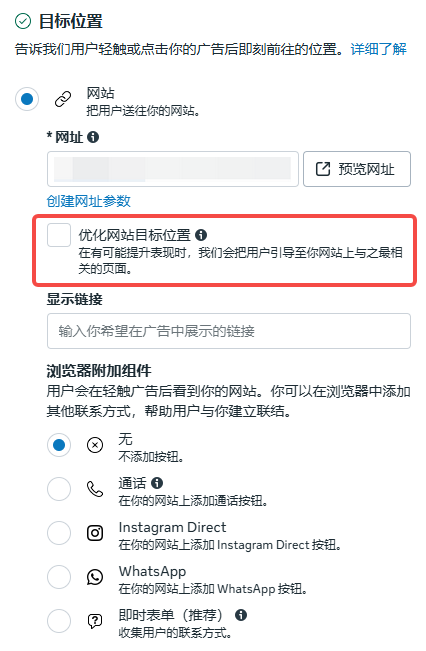 在传统的广告投放中,广告主通常需要手动为每条广告设定一个固定的落地页(Landing Page),比如将所有点击都引导至首页,或某个特定的商品页。这种方式相当于只给所有用户一条固定的、不变的路线,无论他是被折扣吸引的新客,还是寻找特定型号的老客都要从固定的位置来进行点击购买。而“优化网站目标位置”功能,则自动授权给Meta的广告系统一个更聪明的任务:不再只是机械地把用户送到我们预设的那个页面,而是从广告主提前设置好的一批“候选页面”中,实时地为每一次点击智能选择并测试哪一个页面带来的转化效果最好。