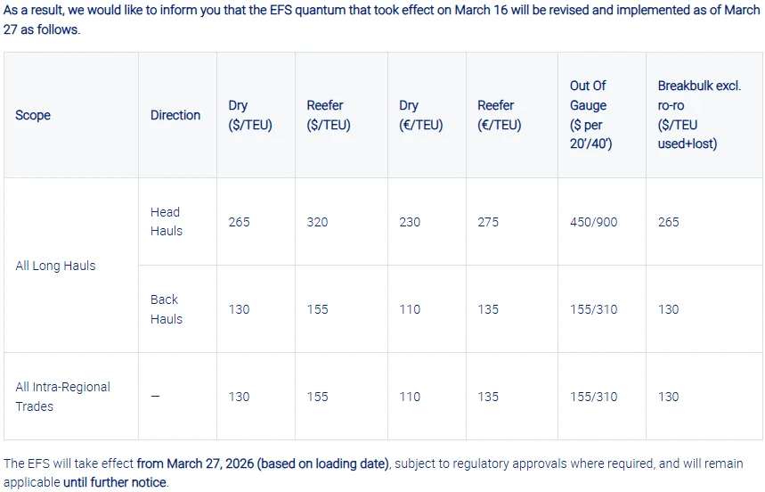 达飞(CMA CGM)宣布于3月27日(以装船日为准)起执行最新的紧急燃油附加费标准。针对全球长航线的主航向,干箱加收265美元/TEU,冷藏箱加收320美元/TEU,超规货物最高加收达900美元。
