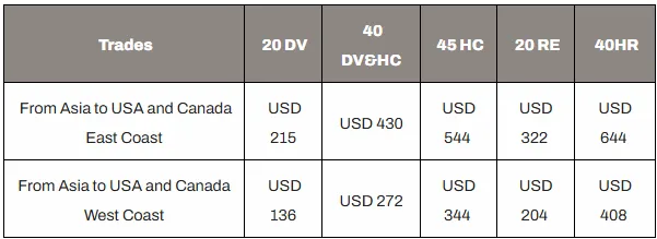 MSC针对亚洲至美国及加拿大的航线,已于3月16日起生效。其收费标准从136美元到644美元不等。