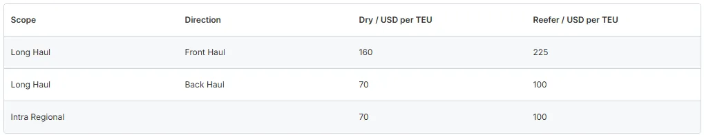 海洋网联船务(ONE)将于3月24日起执行新标准。针对亚洲区内短途航线,干箱加收80美元/TEU,冷藏箱加收105美元/TEU。长途航线,干箱加收160美元/TEU,冷藏箱加收210美元/TEU。
