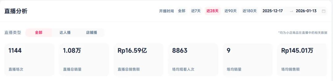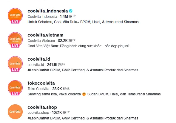 Cool-Vita累计与将近6万名带货达人进行合作,发布的带货视频超20万个,其中粉丝量在1万至5万之间的核心腰部达人,贡献了接近一半的销售额。其TikTok直播总场次已超过1000场,创造了可观的销量,场均销售额稳定在百万印尼盾级别。