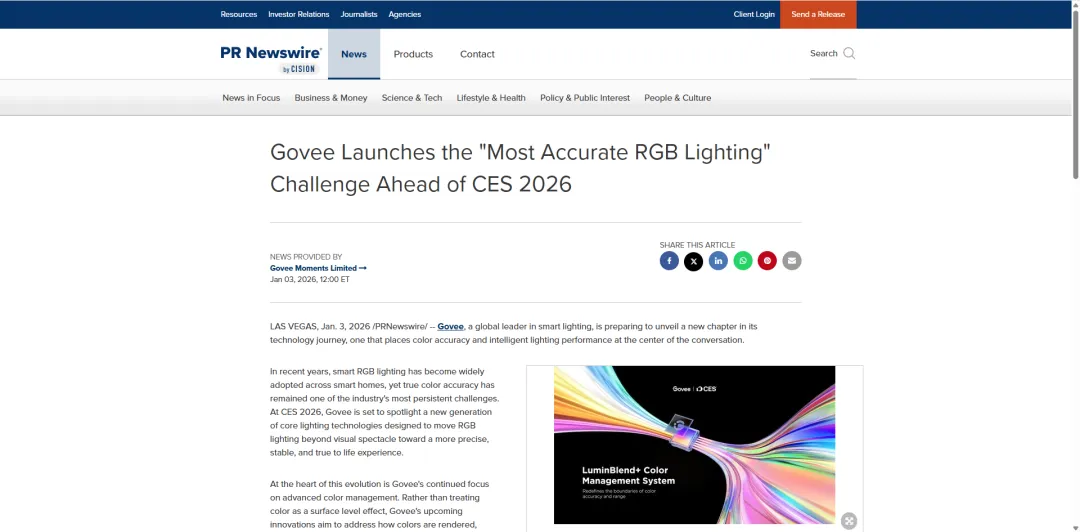 2026年1月3日,Govee提前发布展前PR,发起“The Most Accurate RGB Lighting”挑战赛,面向创作者和红人,讨论“色彩准确性对智能家居的意义”。