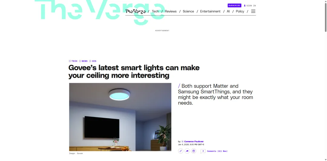展后,Govee没有高频次复述卖点,而是把传播权交给第三方权威媒体。Android Central评价它“重新定义了智能照明该做什么”,The Verge聚焦其天花灯新品,称其“开辟了家庭空间新入口”。
