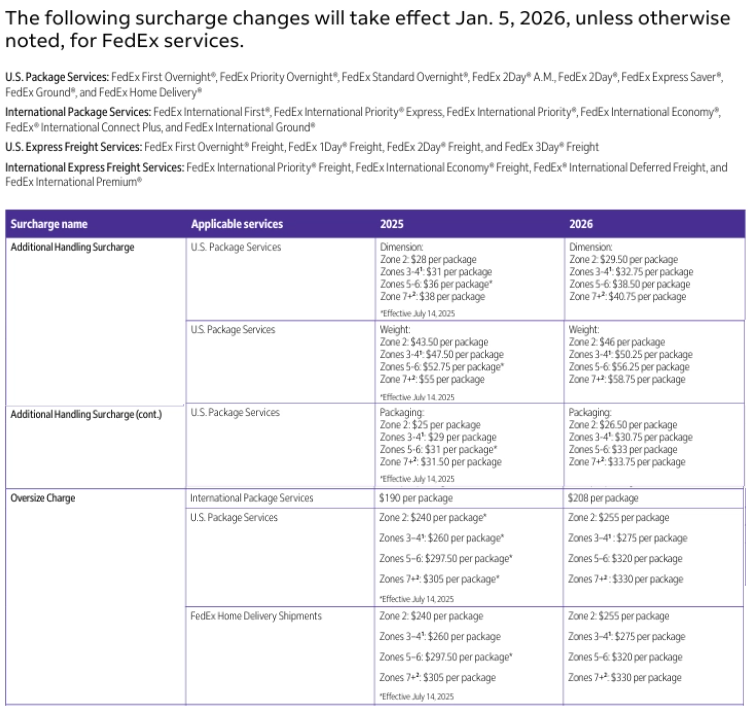 近日,全球物流巨头FedEx发布了一则将于2026年生效的调价通知,涵盖美国国内、进出口业务以及多项附加费,包括额外处理费、超大件费、住宅送货费等。这波涨价,无疑将对广大跨境卖家和外贸企业带来显著影响!