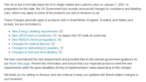 英国将于明年1 月 1 日正式退出欧盟单一市场和海关联盟一事,使得亚马逊平台的政策也随之更新。除了税费改动,近期亚马逊还发布了“商品合规性和贴标要求变更”的通知。在公布的新规中,亚马逊表明 CE 合规标志将被取代。