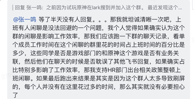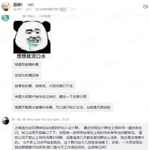 在公司《原神》群中发现员工上班非常专注地聊游戏,感到非常不满。