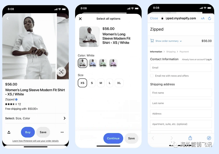 “当有人通过Hosted Checkout的产品 Pin 图购物时,他们会选择他们想要的确切产品——颜色或尺码。然后,他们点击“购买”通过 Shopify 进入Hosted Checkout体验。从那里开始,这只是运输和付款等最终细节的问题。”