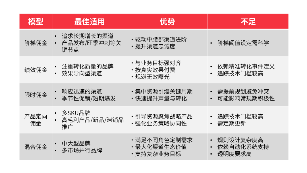 为了更科学地管理合作方、撬动增长潜力,成熟品牌通常会基于业务目标,灵活选择以下几种常见佣金结构:
