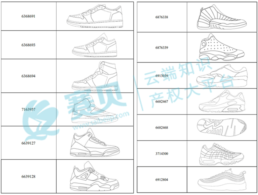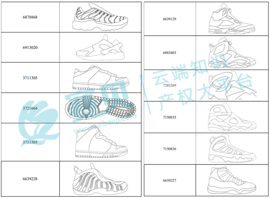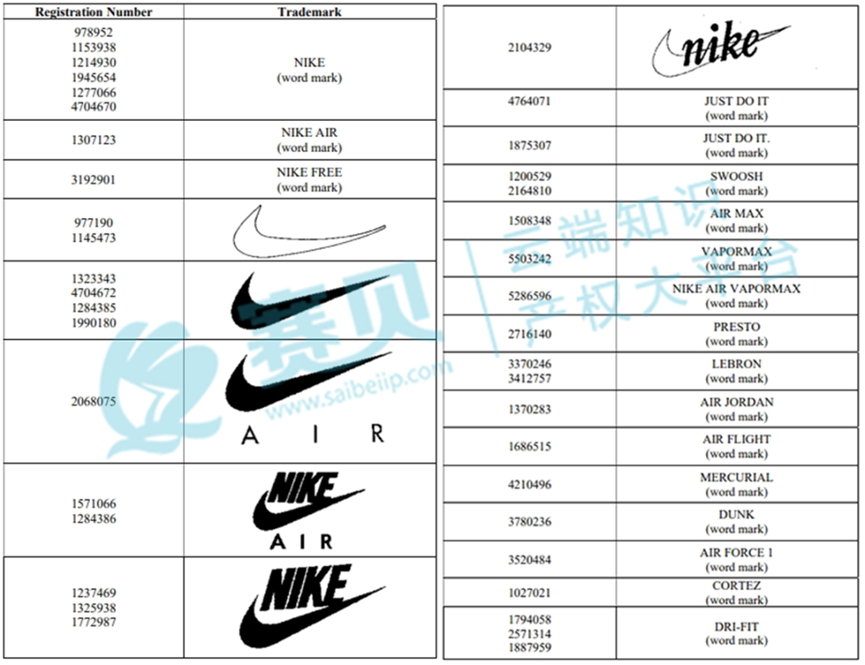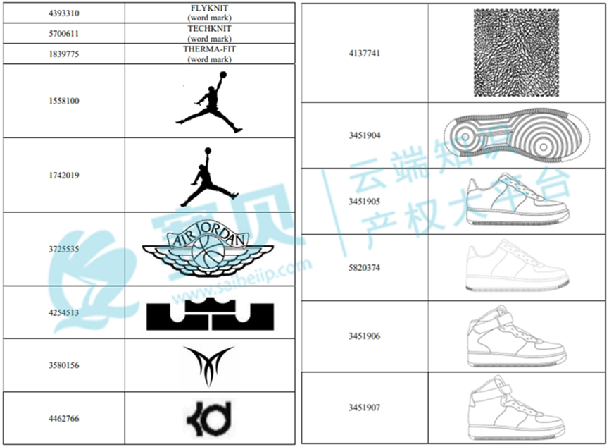 Nike维权涉及的注册商标较多,不局限于其知名度较高的NIKE、AIR JORDAN等文字商标,还有小钩子、球鞋样式等商标。