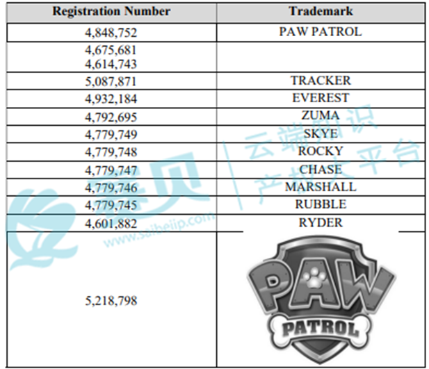维权商标包括‘PAW PATROL’、‘TRACKEREVERESTZUMA’、