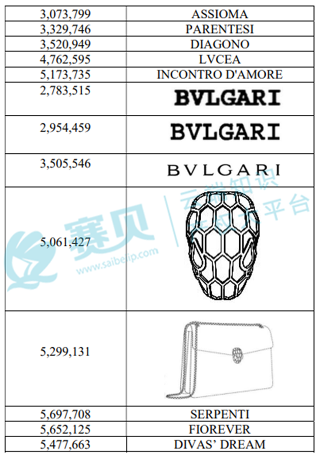 Bulgari, S.P.A.已为其品牌名称注册相关商标,其中文字商标 BVLGARI 需格外留意。该商标涵盖多个类别。特别要关注最后两个图形商标,重点为蛇头图形商标。