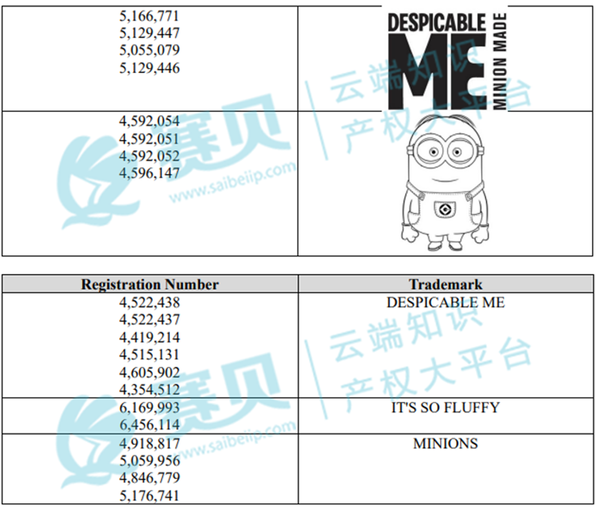 《神偷奶爸》系列商标:如 “DESPICABLE ME”“IT'S SO FLUFFY”“MINIONS” 以及 “DESPICABLE ME MINION MADE” 等,在多类别注册,包括玩具、文具、服装、箱包等,注册时间2013-2020年不等。