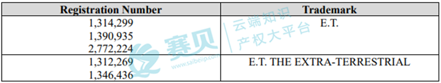 《E.T. 外星人》系列商标:在第6类(金属钥匙链)、第9类(预录视频、游戏程序)、第16类(纸制品、文具)、第28类(玩具、游戏)注册,注册时间跨度1985-2003年。
