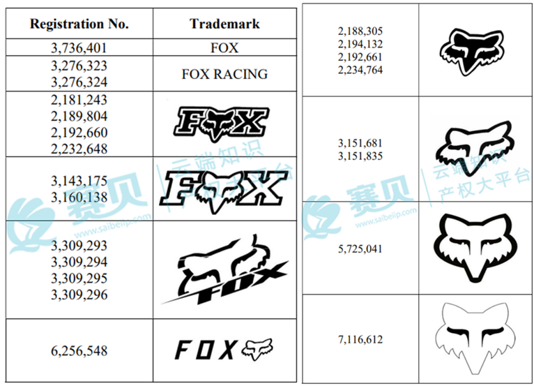 案件涉及 FOX 相关美国注册商标,涵盖 FOX RACING USA, INC. 和 FOX HEAD, INC. 等主体名下的多类别商标。商标形式包括 “FOX”文字、“FX”组合标识及狐狸头图形,覆盖国际分类第9类(护目镜、头盔等防护装备)、第16类(贴纸、日历等印刷品)、第18类(箱包、雨伞等皮革制品)、第25类(服装、鞋帽等服饰产品)及第35类(零售及在线零售服务)。