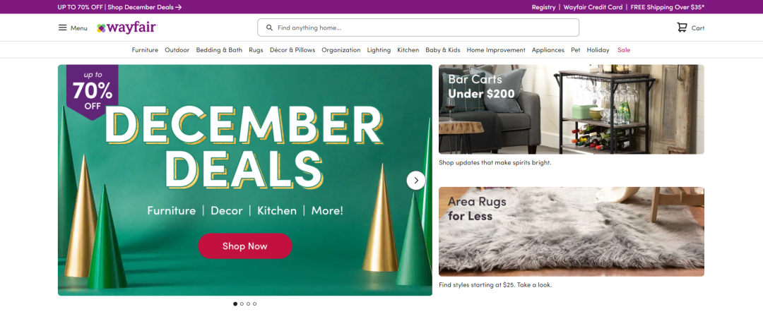 Wayfair业务遍布全球,主要专注于品牌家具家居用品,经营范围包含家居、家具、家电、家纺、装饰品、灯具、建材、户外用品等各类产品,对做家居家具大件产品的跨境电商卖家来说,是一个不错的平台选择。