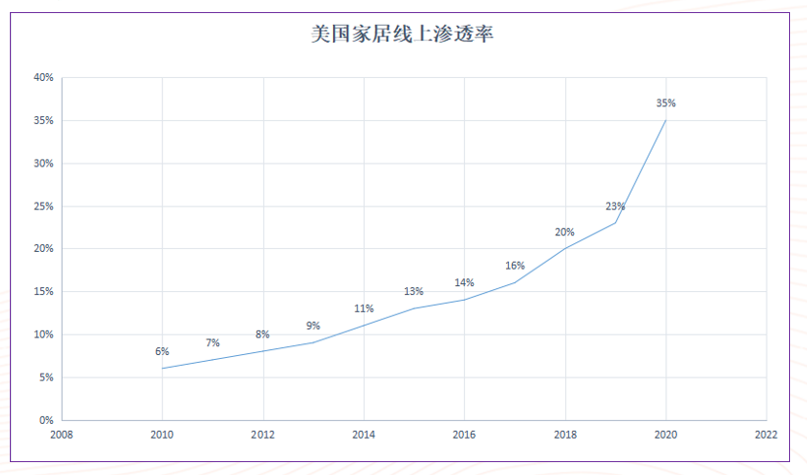 对于“海外线下消费是否更受欢迎”这个顾虑,我们可以直接用数据显示,2020年美国家居线上渗透率高达35%,未来将持续增长。这说明更多的消费者倾向选择线上网购家居家具产品,线上需求和销售大幅上升。
