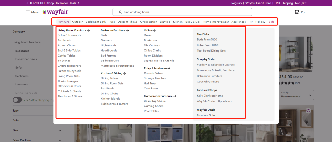 当我们打开Wayfair官网,观察首页导航条和二三级产品类目页面,就会发现家居家具产品的细分程度高得可怕,呈现出来的垂直行业专业度,立马就和综合型跨境电商平台区分开来了。Wayfair擅长从用户需求出发,通过细致分类,更便于用户精准查找产品,让消费者线上在搜索形式和视觉风格等各方面的体验感整体提升。