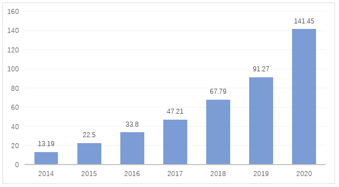 Wayfair营业收入17年来保持高速增长,其中,2020年美国市场销售额已占到总销售额84%,净收入也由2019年的91.27亿美元飙升至141亿美元,同比增长55%,每位活跃用户平均会给Wayfair带来484.4美元的净收入,同比增长 7.3%。