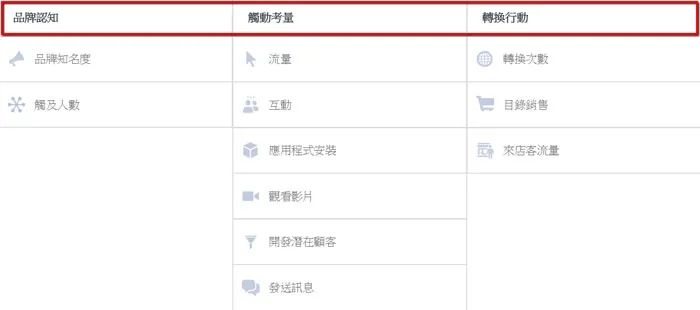所以,在拟定任何策略、目标之前,你需要深入了解市场、目标受众、竞争对手,这将有助于创建更有效的广告活动。请记住,对于不同受众来说,需要以不同方式进行推广,而不是试图只用一则广告活动打动所有的人,所以Facebook广告分成3种不同的活动主轴:品牌认知、触动考量、转换行动。